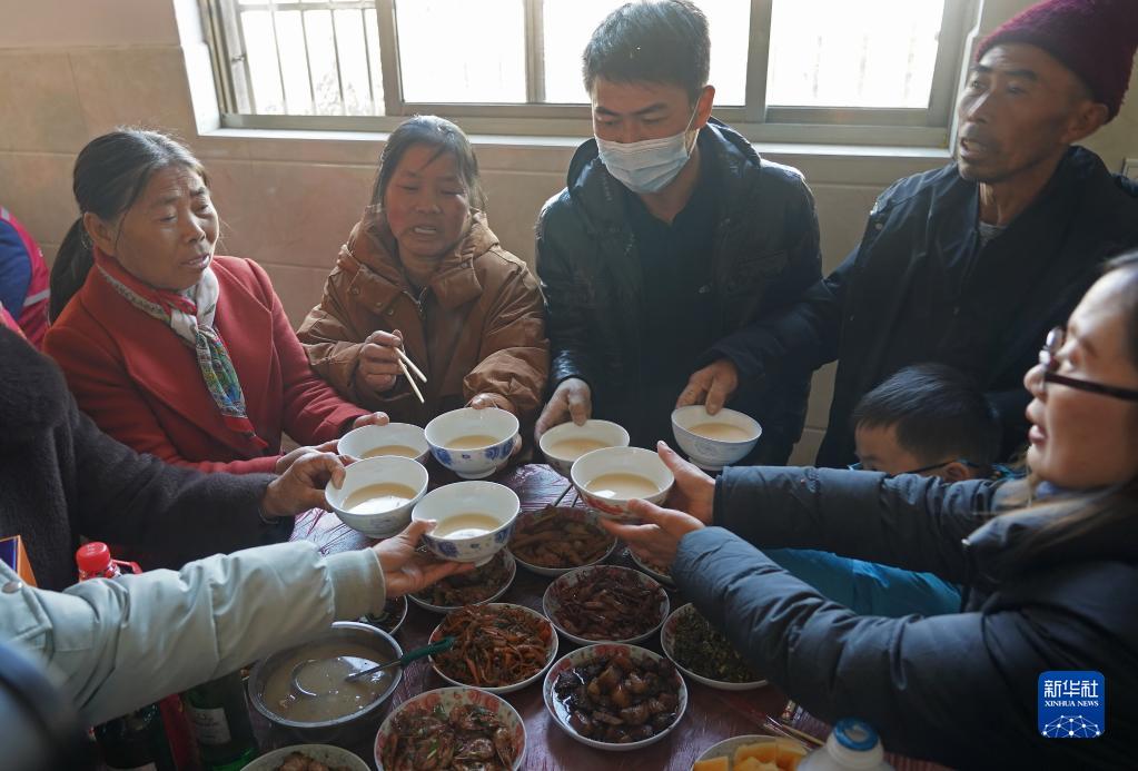 在靖安县黄龙村食堂,钱芳勇一家人与亲属和村民一起吃团圆饭(1月30日摄)。