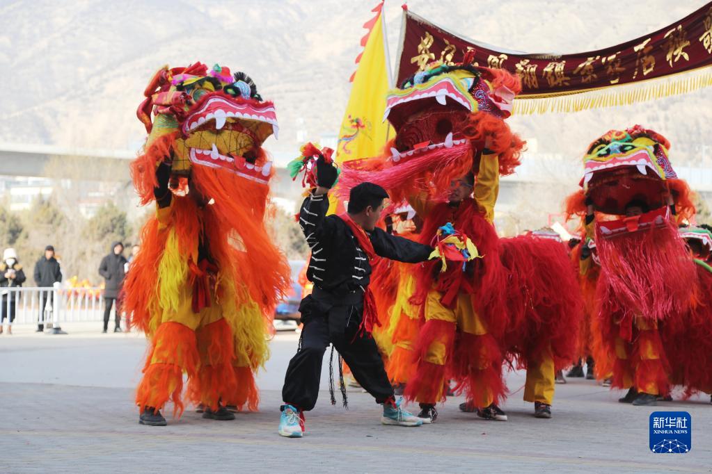 1月31日,甘肃省定西市安定区凤翔镇的社火队员在表演舞狮。