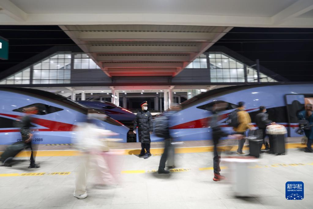 1月31日,务工人员在毕节高铁站工作人员的引导下进入站台登车。
