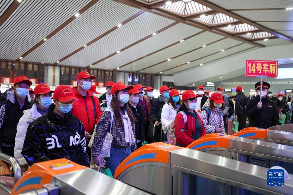 1月31日,务工人员在毕节高铁站闸机口前排队候车。