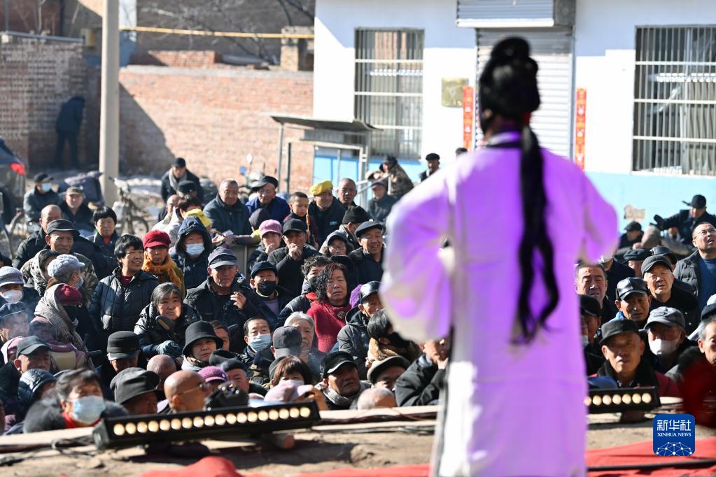 1月30日,在山西省太原市清徐县孟封村,村民观看太原市晋剧艺术研究院实验二团演员演出。