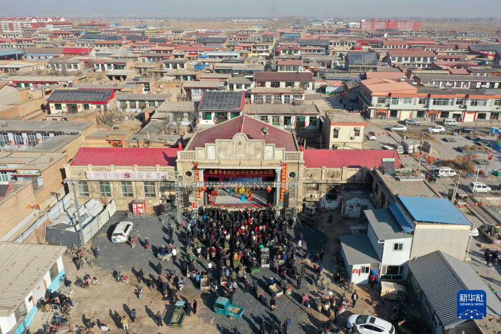 1月30日,太原市晋剧艺术研究院实验二团演员在山西省太原市清徐县孟封村演出(无人机照片)。