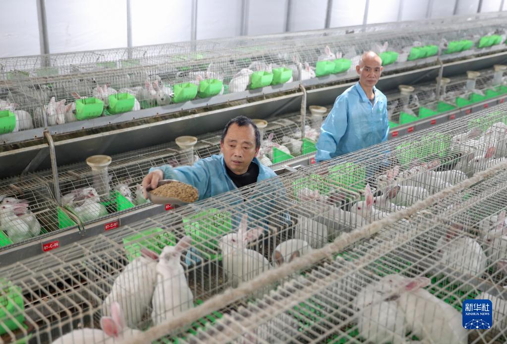 1月31日,华蓥市永兴镇马架坪村肉兔饲养基地的工作人员在给肉兔添加饲料。