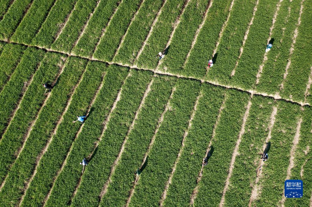 1月31日,村民在浙江省诸暨市同山镇绿剑村的田间护理小麦(无人机照片)。
