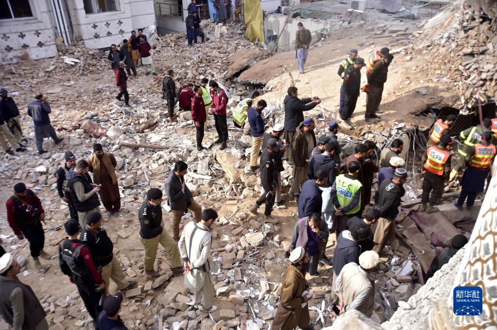 1月31日,在巴基斯坦白沙瓦,救援人员和安全人员查看爆炸袭击现场。