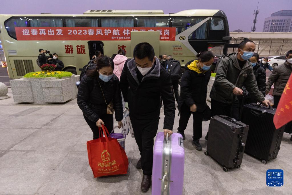 2月1日,来自四川省遂宁市的务工人员乘坐务工大巴直通车来到成都东站,准备乘坐高铁。