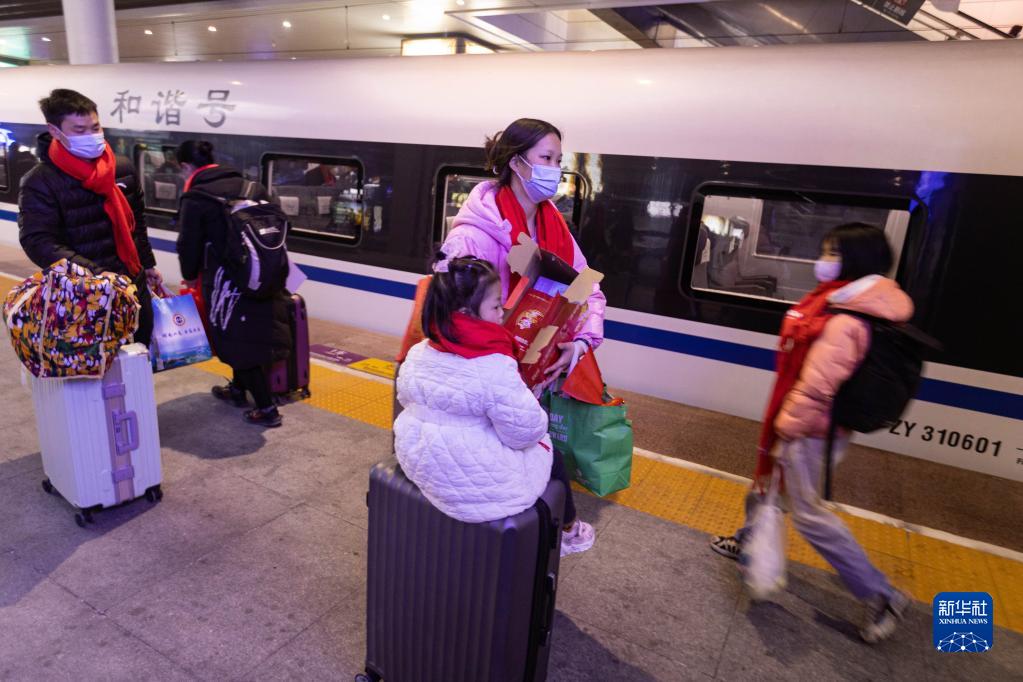 2月1日,来自四川省遂宁市安居区中兴镇的陶昌应(左一)一家三口,从成都东站乘坐D1753次列车前往广州南站,开启务工之旅。