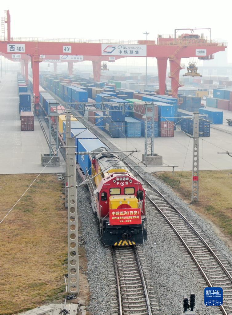 当日,满载日用百货的X8151次中欧班列从西安国际港站驶出,开往白俄罗斯首都明斯克。2023年1月,陕西中欧班列开行突破300列,达到346列,创历史同期最好成绩,取得新年开门红。