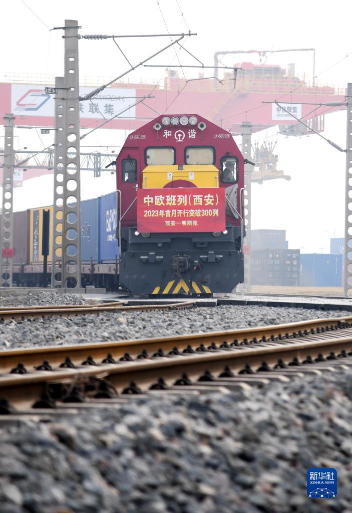当日,满载日用百货的X8151次中欧班列从西安国际港站驶出,开往白俄罗斯首都明斯克。2023年1月,陕西中欧班列开行突破300列,达到346列,创历史同期最好成绩,取得新年开门红。