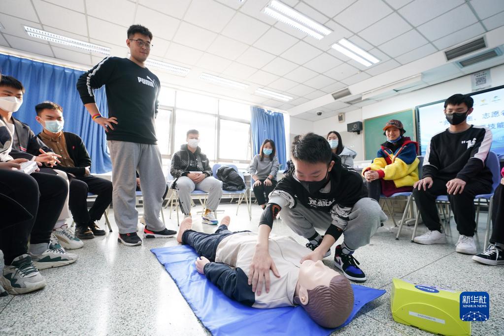 杨曦(下)在学校参加冬奥志愿者急救技能培训(2021年11月27日摄)。