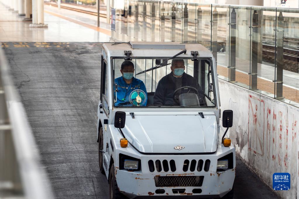 在南昌火车站,张细茂驾驶牵引车准备返回行包车间(2月1日摄)。