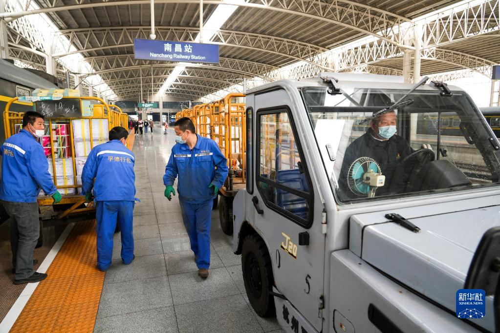 在南昌火车站站台,牵引车司机张细茂等待工人分发搬运行李包裹(2月1日摄)。