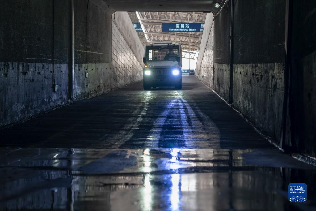 在南昌火车站地下通道,张细茂驾驶牵引车运送行李包裹(2月1日摄)。