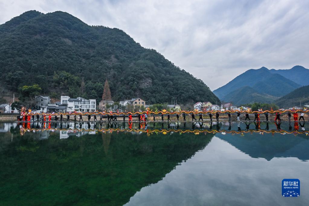 当日是农历正月十一,在梅花锣鼓的伴奏下,浙江省杭州市富阳区湖源乡窈口村女子板龙队举起由50余张板凳连起来的百米板龙舞动起来,拉开了湖源乡新春系列迎元宵活动的序幕。
