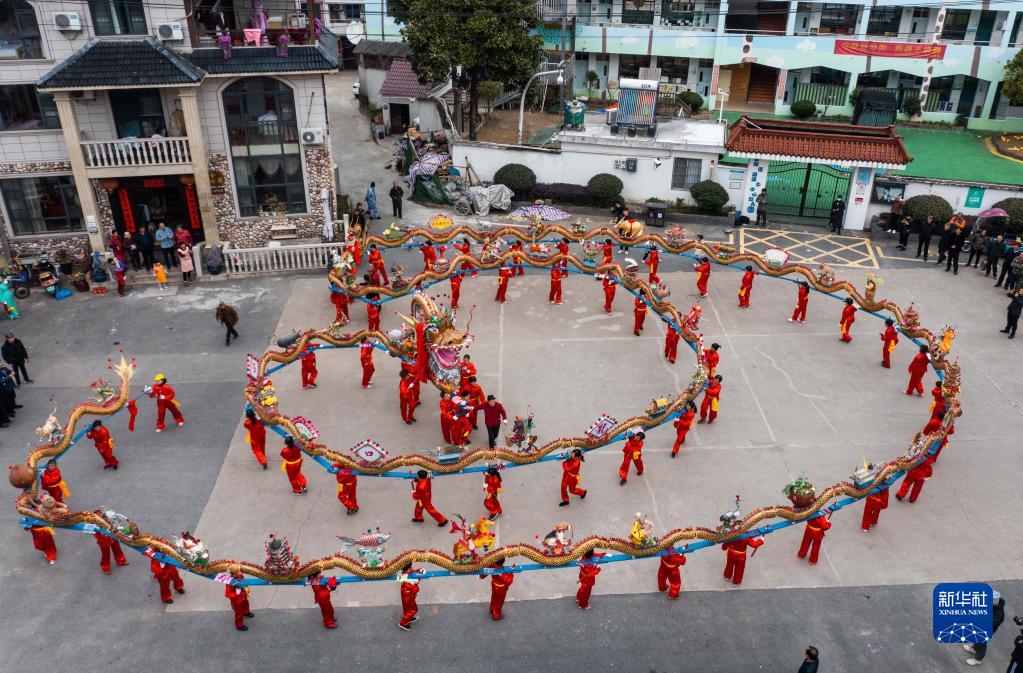 2月1日,窈口村女子板龙队在湖源乡进行板龙舞龙表演(无人机照片)。