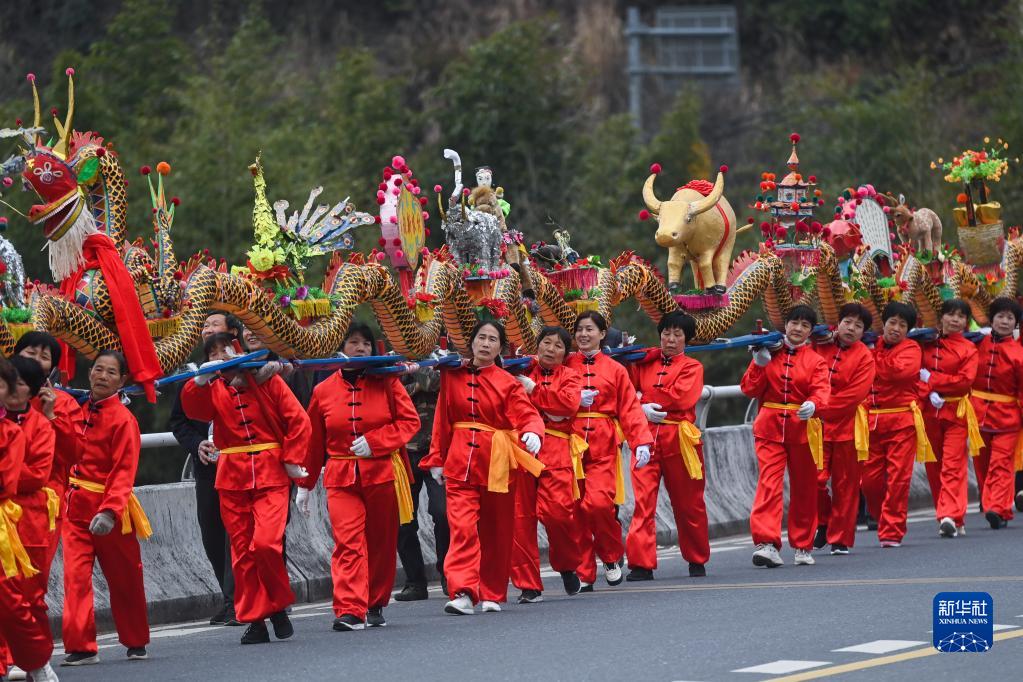 2月1日,窈口村女子板龙队在湖源乡走街串巷进行板龙舞龙表演。