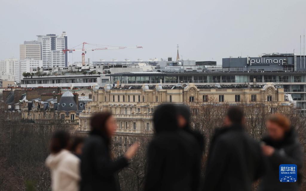 2月1日,人们在法国巴黎望向远处的建筑和塔吊。