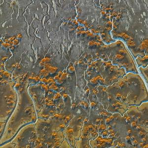 近日,在辽宁盘锦辽河口湿地,海水在潮汐作用下涌入辽河口湿地的潮沟,并凝结成冰,从高空看去,宛若蜿蜒曲折、形态各异的“冰脉”。