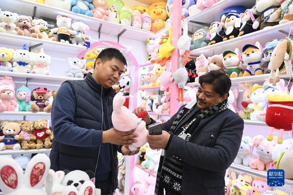 2月2日,来自印度的客商拉贾(右)在义乌国际商贸城的一家玩具店铺内选购。