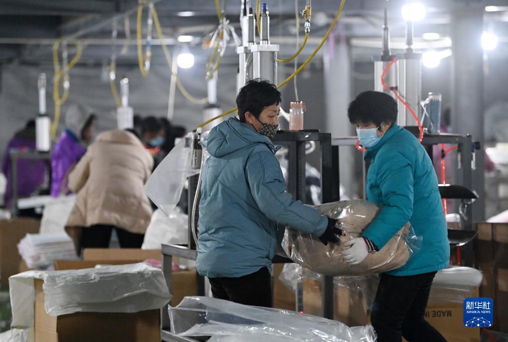 在天津市武清区崔黄口镇安芝金林地毯有限公司,工人搬运材料(2月1日摄)。