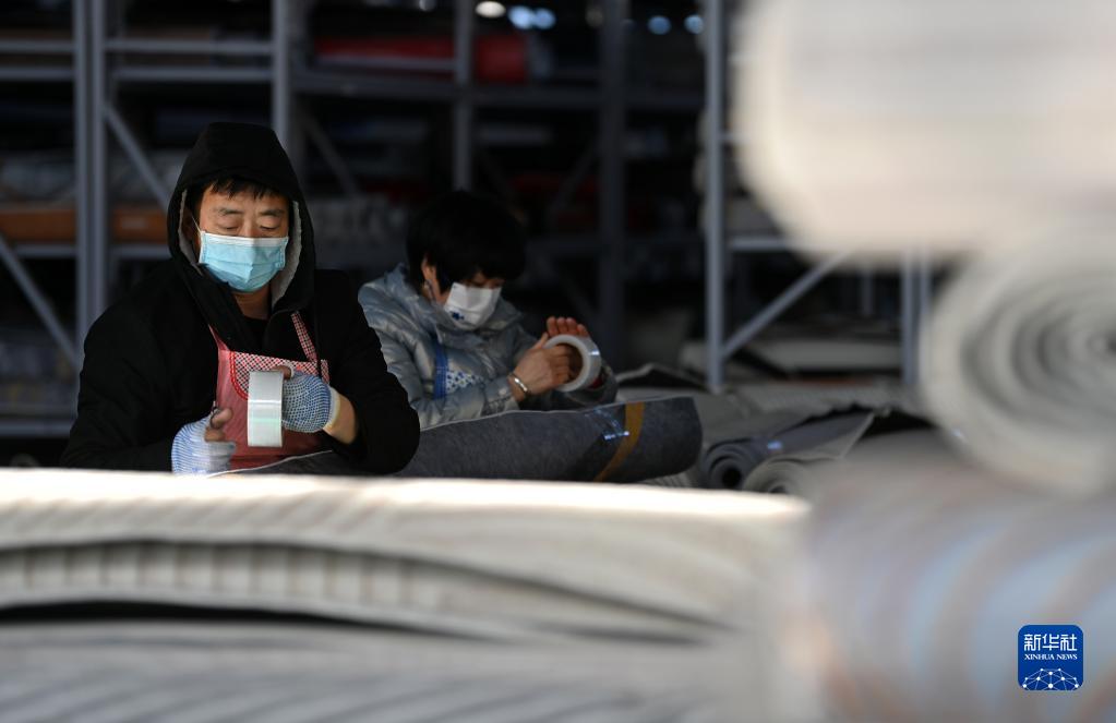 在天津市武清区崔黄口镇凯利地毯有限公司,工人打包地毯(2月1日摄)。