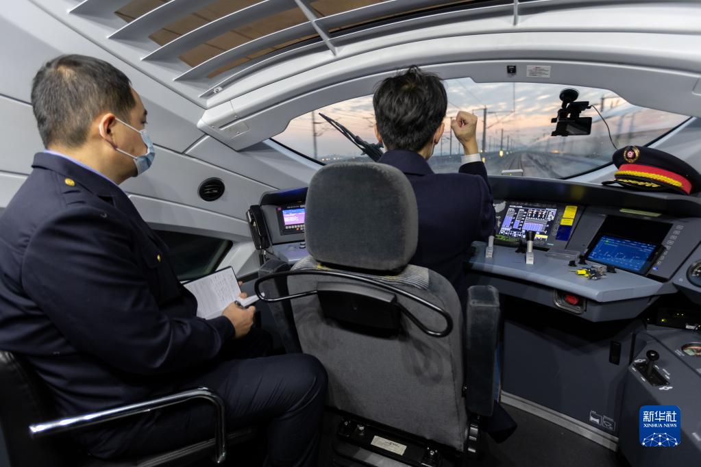 2月1日早晨6时30分许,上海机辆段司机陈逸东驾驶DJ7715次高铁确认列车行驶在工作路段,上海高铁基础设施段随车添乘班班长陈晓华(左)在一旁观察和记录道路基础设施情况。此时窗外天刚蒙蒙亮。