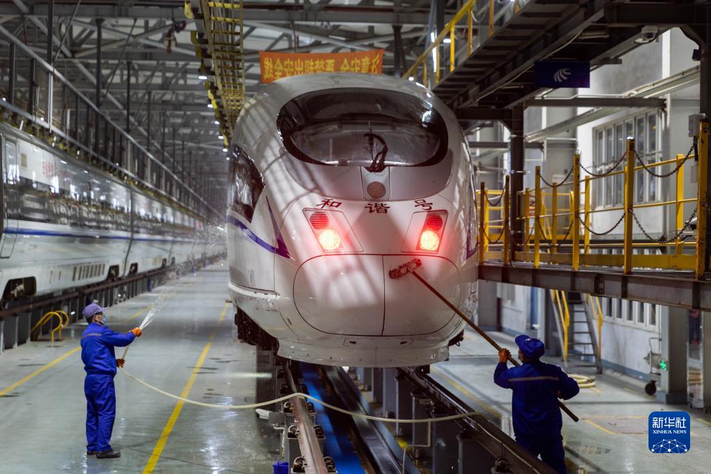 2月1日凌晨1时许,上海动车段工作人员清洗入库南翔动车运用所的DJ7716次高铁确认列车。