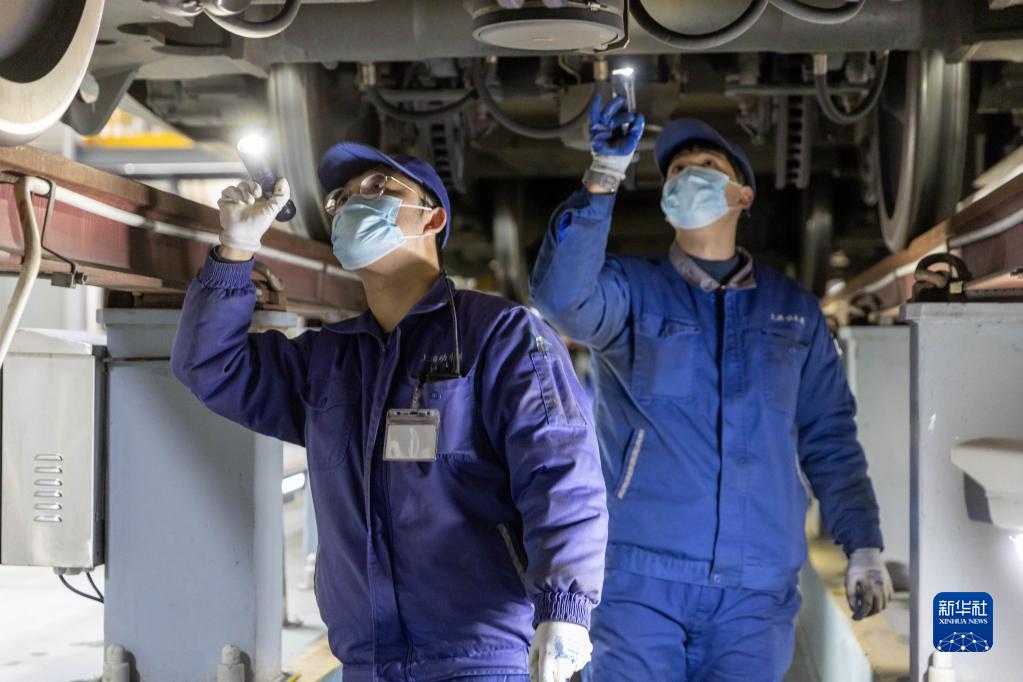 2月1日凌晨1时许,上海动车段地勤机械师检修入库南翔动车运用所的DJ7716次高铁确认列车车况。