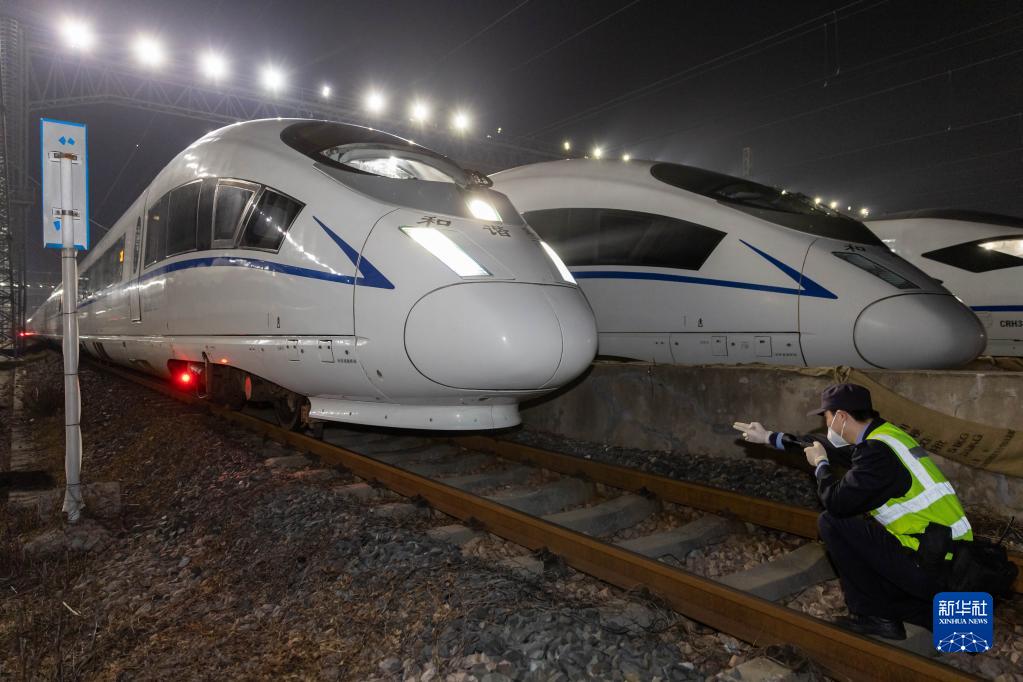2月1日凌晨3时许,上海动车段随车机械师吴家乐检查停靠南翔动车运用所存车线上的DJ7716次高铁确认列车。