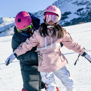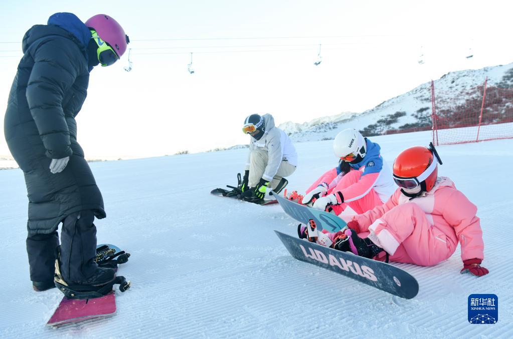 在新疆白云国际滑雪场,许秀娟(左)在为小学员储宥善(右一)及其家长介绍滑雪注意事项(1月26日摄)。