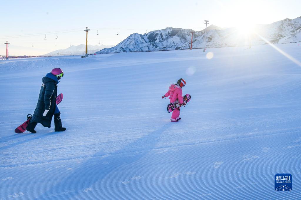 在新疆白云国际滑雪场,许秀娟(左)带着小学员储宥善前往雪道,准备上课(1月26日摄)。