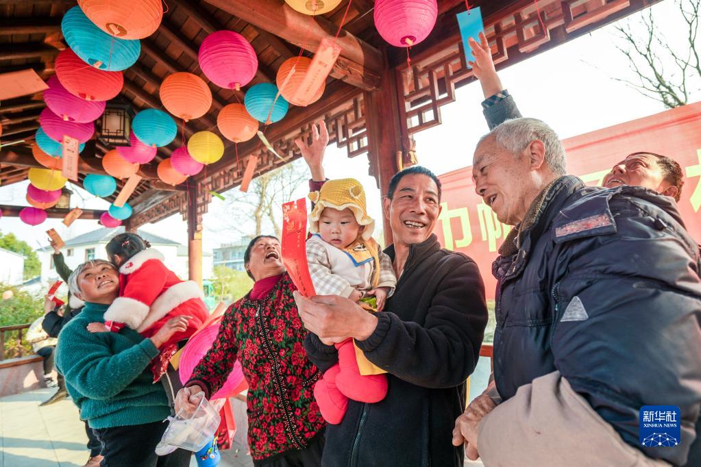 2月2日,村民在浙江省湖州市长兴县煤山镇仰峰村文化礼堂外赏花灯、猜灯谜。