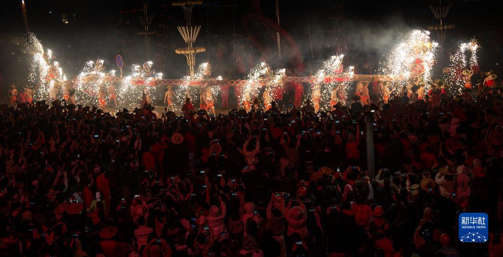1月31日晚,民间艺人在广东省揭阳市揭东区磐东街道表演国家级非物质文化遗产——乔林烟花火龙,吸引大量市民游客。