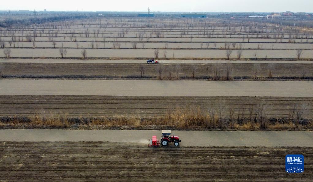 2月2日,工人在位于天津市静海区蔡公庄镇的天津市农业科学院农作物研究所示范基地操作机器播种春小麦原种(无人机照片)。
