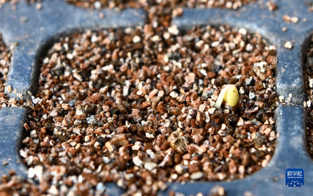 这是2月2日在天津市农业科学院创新基地大棚内拍摄的一株刚刚破土发芽的花椰菜试验种。