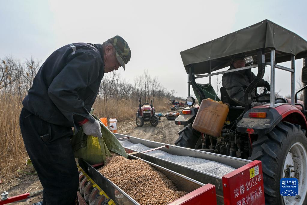 2月2日,工人在位于天津市静海区蔡公庄镇的天津市农业科学院农作物研究所示范基地向机器内装填春小麦原种。
