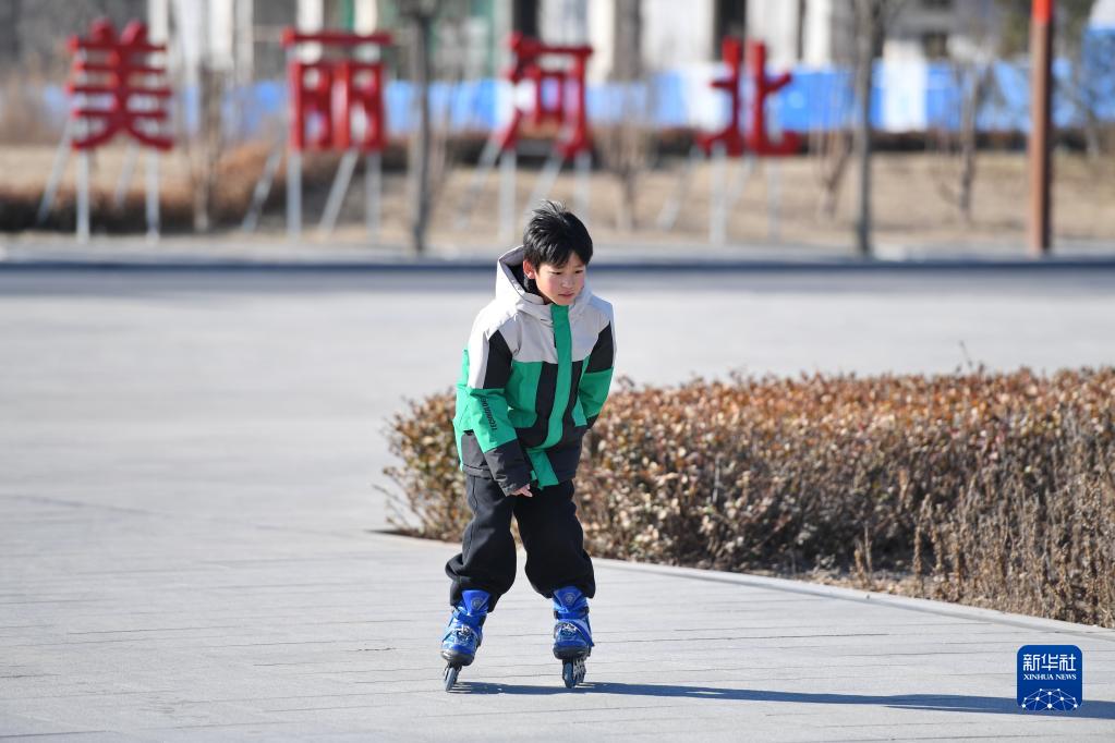 马兰花儿童声合唱团团员顾站豪在河北省保定市阜平县的一个广场上滑轮滑(1月30日摄)。