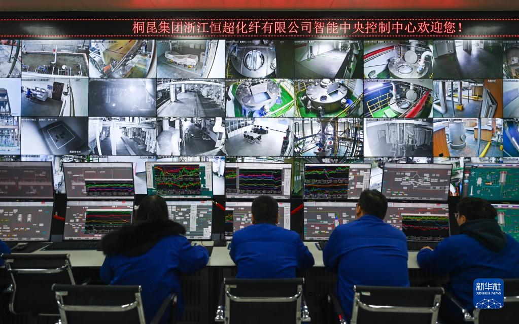 位于桐乡市洲泉镇工业园区的桐昆集团浙江恒超化纤有限公司的智控中心内,工作人员在查看各条生产线的运行情况(2月2日摄)。春节期间,该公司的生产设备全负荷运转,1000多名职工坚守在生产一线,全力冲刺一季度“开门红”。