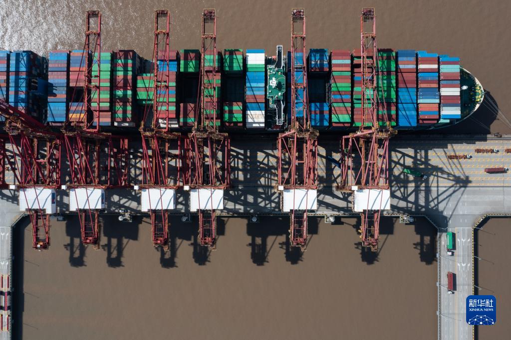 在宁波舟山港金塘港区大浦口集装箱码头上,一艘外籍货轮正在靠泊卸货(1月31日摄,无人机照片)。2022年宁波舟山港完成年货物吞吐量超12.5亿吨,连续14年位居全球第一;完成集装箱吞吐量3335万标准箱,位居全球第三。