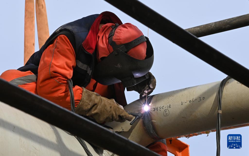 2月2日,工人在海油工程塘沽建造场地进行焊接作业。