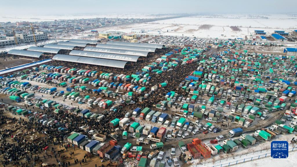 2月1日,位于新疆伊宁县愉群翁回族乡阿勒推村的新疆创锦黄公农产品交易市场开市,市场商品琳琅满目,牛羊马交易火爆。