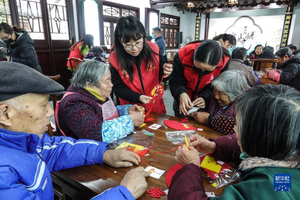 歇马桥村志愿者辅助村里的老人做元宵节灯笼(2月2日摄)。该村通过古村落保护与村庄环境整治工作,建设成为长三角乡村文化传承创新典型村落。