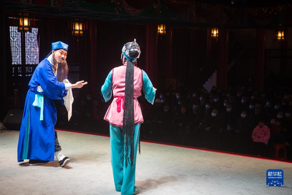 2月3日,武汉楚剧院演员在表演楚剧《打豆腐》。