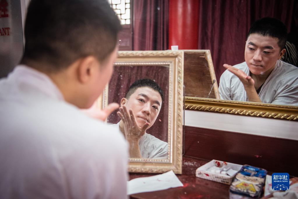 2月3日,武汉楚剧院演员在后台做准备。