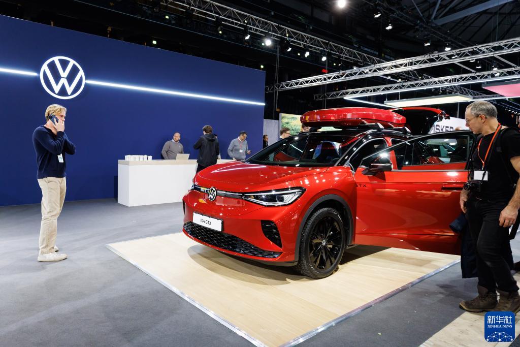 2月3日,人们在瑞典斯德哥尔摩举办的电动车展上参观大众电动车。