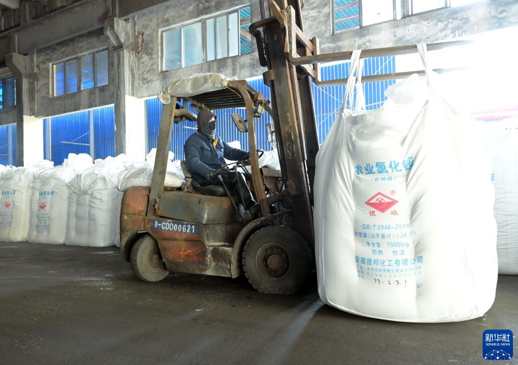 2月3日,在淮南市一家化工有限公司,工人驾驶叉车搬运化肥。
