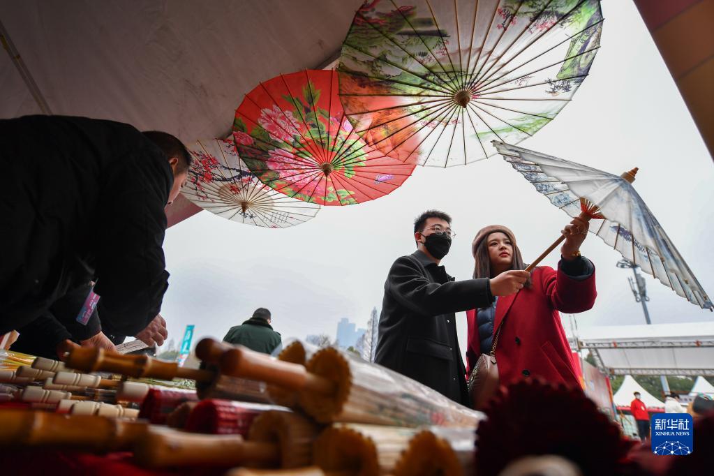 2月4日,市民和游客在湖南非遗元宵喜乐会现场参观非遗项目“浏阳油纸伞制作工艺”。
