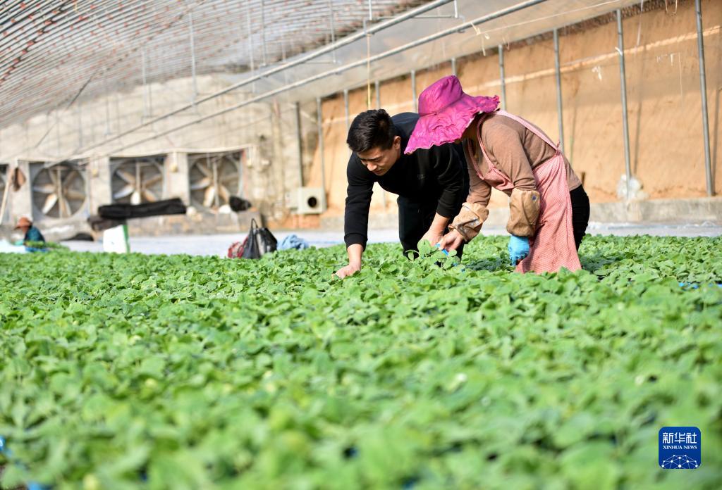 2月4日,河北省威县和青育苗基地工人在查看秧苗长势。