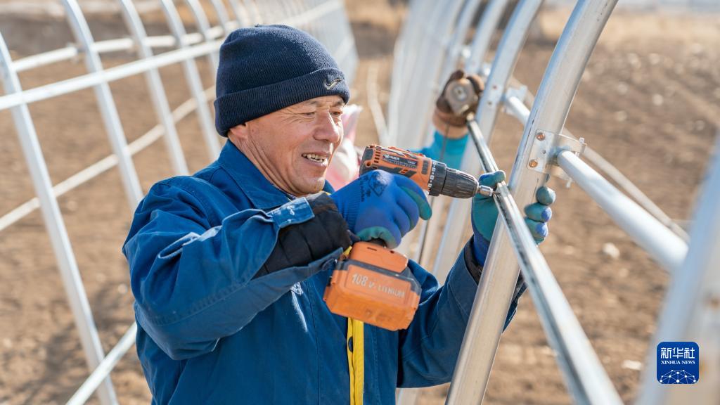 2月4日,工人在宁夏隆德县沙塘镇搭建钢架拱棚。