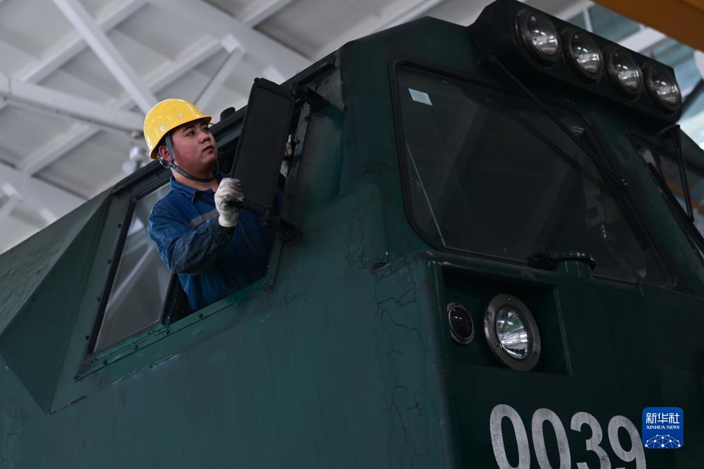 2月4日,在格尔木机务段检修车间,马国仁检查机车后视镜。
